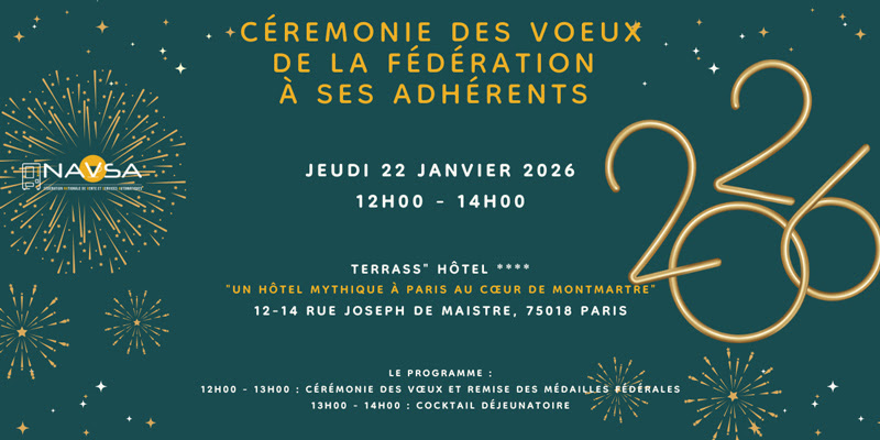 Le 22 janvier 2026, de 12h00 à 14h00, la Fédération adressera ses vœux à ses adhérents lors d’une cérémonie qui se tiendra au TERRASS’’ HOTEL****, 12-14 Rue Joseph de Maistre, 75018 Paris.
